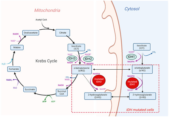 The IDH family is composed of three different enzymes, IDH1, IDH2, and IDH3, that are all involved in cell metabolism and catalyze the same reaction, namely the oxidative decarboxylation of isocitrate (ICT) into α-ketoglutarate (α-KG). Despite this functional overlap, their role in cellular metabolism is non-redundant. The cytoplasm and peroxisomes are the most frequent localizations of the IDH1 enzyme, while the IDH2 and IDH3 enzymes are located in the mitochondrial matrix, where they are responsible for one of the steps in the tricarboxylic acid (TCA) cycle (Figure 1).