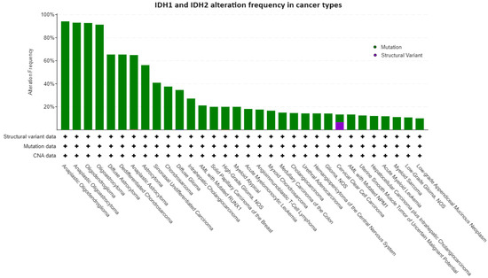 IDH1 and IDH2 alterations in cancer types. The figure shows the tumor types with higher alteration frequencies in the IDH1 and IDH2 genes. We filtered the tumor types with at least 10% of altered cases. The data and figures were imported from the GENIE Cohort v14.1 public dataset (all available samples with CNA and mutation on 12 December 2023, namely 147,940 samples/127,336 patients) available at https://genie.cbioportal.org/ (accessed on 12 December 2023).