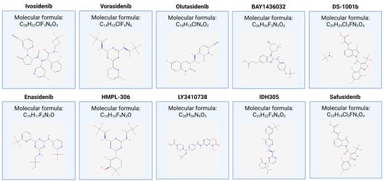 Table 2 summarizes the features of completed and ongoing clinical trials that evaluate IDH inhibitors for the treatment of glioma, and Figure 3 shows the chemical structures of the drug tested.