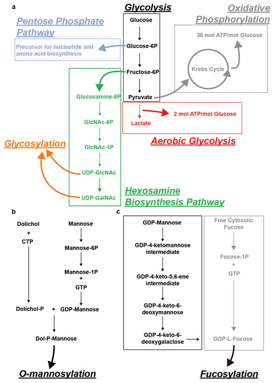 Schematical representation of sugar nucleotide biosynthesis for various types of glycosylation. (a) Uridine diphosphate N-acetylgalactosamine (UDP-GalNAc), UDP-N-acetylglucosamine (UDP-GlcNAc) biosynthesis from glucose via the glycolysis-related hexosamine biosynthesis pathway (HBP). Other glycolysis-related pathways including the pentose phosphate pathway, aerobic glycolysis and oxidative phosphorylation are also depicted. (b) Dolichol-phosphate-mannose (Dol-P-Man) biosynthesis from Dolichol and mannose. (c) Guanosine diphosphate fucose (GDP-fucose) biosynthesis from guanosine diphosphate mannose (GDP-mannose) (de novo synthesis) and free cytosolic fucose (salvage pathway).