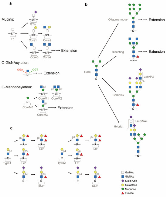 Representative glycans common in protein glycosylation. (a) O-linked (mucins, O-GlcNAcylated and O-mannosylated) glycosylation. Core structures of O-GalNAcylated mucins consist of Thomsen-nouveau (Tn) antigen, Thomsen–Freidenreich antigen (TF antigen or T antigen or core 1), core 2, core 3, core 4 and sialyl-Tn (STn). After adding the first GalNAc to serine/threonine (S/T), this monosaccharide-linked structure is termed the Tn antigen. If galactose is added to the Tn antigen, it will result in the formation of core 1. If a sialic acid is attached to Tn, a terminal structure STn is formed. O-GlcNAcylation of proteins is balanced between O-GlcNAc transferase (OGT) and O-GlcNAcase (OGA). O-mannosylation contains the major structures of coreM0, coreM1, coreM2 and coreM3. Linkage between GlcNAc and mannose differs CoreM1 (β1-2 attachment) and CoreM3 (β1-4 attachment) structures. (b) Asparagine (N)-linked (N-GlcNAcylated) glycosylation. Mature N-glycan precursor is formed from the Man3GlcNAc2 core into oligomannose, complex and hybrid glycans. Extension by the Galβ1-4GlcNAc building block (LacNAc sequence) or GalNAcβ1-4GlcNAc building block (LacdiNAc sequence) is commonly observed in glycans. (c) Terminal glycan structures (Lewis antigens). Common precursors of Type 1 and Type 2 chains are synthesized by a β1,3-GlcNActransferase which catalyzes the attachment of β-GlcNAc block onto glycans and glycolipids (represented by R). Attachment of the outermost galactose defers Type 1 (β1-3 attachment) and Type 2 (β1-4 attachment) glycans. From Type 1 and Type 2 backbones, Lewis antigens, assisted by fucosyltransferases (FUTs) and sialyltransferases, are differentiated into Leb, Lea, SLea, Ley, Lex and SLex.