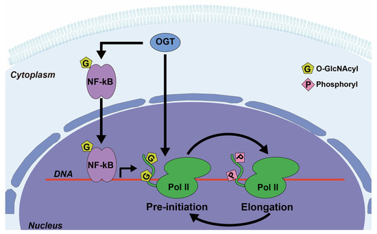 Examples of O-GlcNAc transferase (OGT) involvement in the regulation of various signaling pathways. OGT catalyzes the addition of O-GlcNAc to nuclear factor kappa B (NF-κB), which enhances its nuclear localization and transcriptional activity. OGT also adds O-GlcNAc to the C-terminal domain (CTD) of RNA polymerase II (Pol II), which competes with phosphorylation at the same sites and can switch Pol II between the pre-initiation and the elongation states.