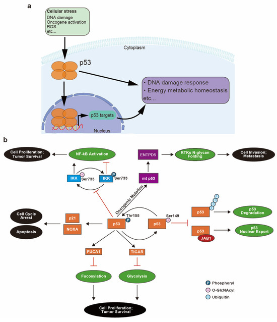 Involvement of p53 in cell stress responses and glycosylation-related pathways and the relationship between p53 glycosylation and cancer progression. (a) Upon cellular stress, p53 is upregulated and translocated into the nucleus to transcriptionally regulate genes that are implicated in stress response pathways including the DNA damage response and energy metabolism homeostasis. (b) During the response to DNA damage, wild-type p53 is phosphorylated and activated, which leads to cell cycle arrest and apoptosis via transcription of p21 and NOXA. p53 also transcriptionally regulates expression of alpha-L-Fucosidase 1 (FUCA1) and TP53-induced glycolysis and apoptosis regulator (TIGAR) protein to modulate fucosylation and glycolysis pathways. Hyperactivation of these two pathways is associated with cell proliferation and tumor survival. p53 inhibits pro-proliferative NF-κB activation by favoring phosphorylation (Ser733) of Inhibitor of nuclear factor-κB (IκB) kinase (IKK), which competes with O-GlcNAcylation (Ser733) of IKK. O-GlcNAcylation of p53 (Ser149) competes with phosphorylation (Thr155), which attenuates ubiquitination-mediated p53 degradation as well as p53 nuclear export mediated by Jun activation domain-binding protein 1 (JAB1). Oncogenic mutant of p53 (mt p53) also promotes cancer by inducing N-glycan folding of receptor tyrosine kinases (RTKs) via the transcriptional regulation of ectonucleoside triphosphate diphosphohydrolase 5 (ENTPD5) protein.
