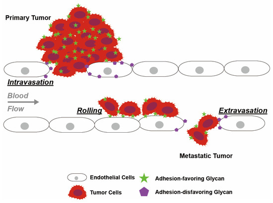 Translocation of leukocytes across tissue barriers during the inflammatory response involves glycoprotein-mediated alterations in cell adhesion, and tumors utilize this mechanism to allow trans-endothelial migration and metastasis [71,138,139]. Glycosylated epitopes on tumor cells facilitate cell rolling along the endothelium by binding to GBPs exposed on endothelial cells [71,80] (Figure 5). These interactions between GBPs exposed on the endothelial cellular surface and the glycan structures of circulating biomolecules such as leukocytes and tumor cells are modulated by enzymes such as glucosyltransferases and FUTs [80,140] (Table 3).