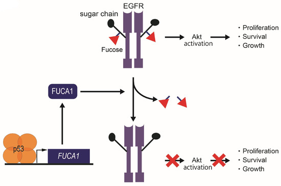 Fucosylation levels are positively associated with cancer cell proliferation. Maintaining higher fucosylation in cancer cells requires securing higher amounts of its sugar nucleotide donor GDP-fucose. Inhibition of GDP-fucose synthesis leads to decreased fucosylation of receptors implicated in the EGFR signaling pathway and, thus, reduces cancer cell proliferation [118]. In addition, knocking down GMDS induces cell cycle arrest and activates apoptosis [45]. FUTs have been shown to promote cell cycle progression [119,120,121,122]. In addition, alterations in FUTs’ mRNA expressions result in changes in the levels of Lewis antigen abundance, which interfere with various well-known cancer-associated signaling pathways including the PI3K/Akt [123] and EGFR/mitogen-activated protein kinase (MAPK) pathways [124]. Multiple lines of evidence have also supported the notion that fucosidases are involved in cancer progression and metastasis, as follows: (1) ectopic expression of FUCA1 in samples having low endogenous levels of FUCA1 significantly attenuates the invasiveness of cancer cells; (2) transient FUCA1 knockdown results in the loss of cell–cell contact; and (3) prolonged FUCA1 knockdown leads to increased cancer cell proliferation, invasion and migration [125]. Moreover, fucosylation can contribute to the hyperactivation of the EGFR, a well-known driver of carcinogenesis, and this can be reversed by FUCA1 overexpression, which reduces fucosylation [7]. These observations indicate the tumor suppressor potential of FUCA1. In contrast, FUCA2 expression is commonly elevated in cancer [117,126]. Anti-FUCA2 antibodies inhibit the proliferation of breast cancer cells, and this is reversed by ectopic expression of FUCA2, suggesting that this fucosidase has oncogenic potential [127].