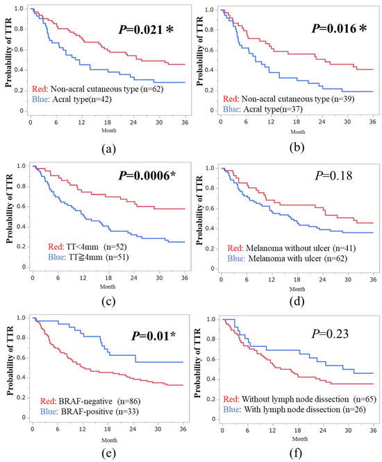 The TTR rate was estimated for each group using the Kaplan–Meier method. The log-rank test was used to compare survival between groups. Hazard ratios (HRs) and 95% confidence intervals (95% CIs) were estimated using Cox’s proportional hazards model in the univariate analysis. Cox’s proportional hazards models were also utilized for multivariate analyses (estimate age, melanoma subtype, BRAF status, tumor thickness or ulceration, sex, and lymph node dissection). The significance level for all tests was set at a two-sided α = 0.05. The significance level for the log-rank test was also set at a two-sided α = 0.05. All statistical analyses were performed with JMP ver.16 (SAS Institute Inc., Cary, NC, USA).
