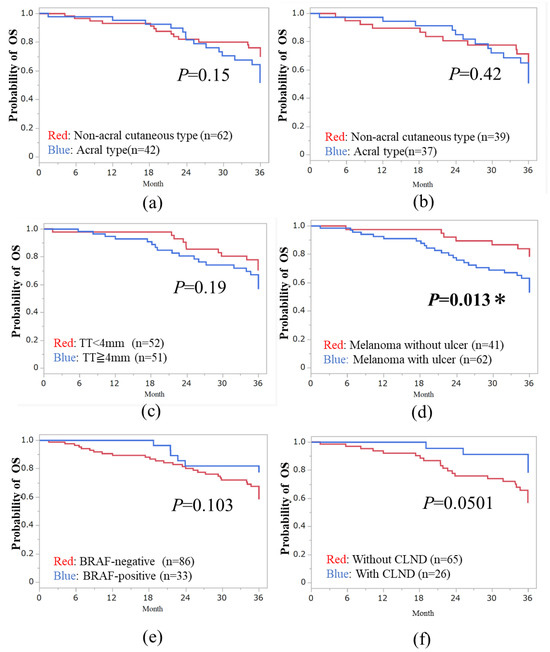 The median overall survival (OS) was 36.0 months (range, 1.5–36 months). The 3-year OS rates for acral, high-CSD, low-CSD, mucosal, and unknown primary types were 47.6% (20/42 cases), 60% (15/25 cases), 64.9% (24/37 cases), 33.3% (4/12 cases), and 50% (2/4 cases), respectively. The 3-year OS based on the AJCC-8th staging was 75% for stage IIIA, 82.9% for stage IIIB, 54.1% for stage IIIC, and 75% for stage IIID disease in both acral and non-acral cutaneous melanomas. We analyzed the OS between acral and non-acral melanomas, and there were no significant differences (p > 0.05, Figure 2a,b). The mucosal type did not exhibit a poorer prognosis compared to non-acral melanoma in terms of OS (p > 0.05). Regarding baseline or treatment-related factors, patients with tumor ulceration had a significantly better prognosis in terms of OS than those without tumor ulceration (HR, 0.39; 95% CI: 0.17–0.85; p = 0.013, Figure 2d). There were no significant differences in median TT, tumor ulceration, BRAF status, and CLND (p > 0.05, Figure 2c,e,f).