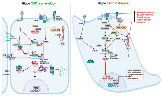 Schematic representation of Hippo “ON” signaling in physiological conditions and Hippo “OFF” signaling in disease states. Upstream signals emanating from tight and adherens junctions and kinases such as NF2/Merlin and KIBRA stimulate phosphorylation of core Hippo kinases, MST, and LATS1/2. The counterparts of the KIBRA/Merlin/FRMD6 complex exist in drosophila while there is evidence for KIBRA and Merlin interaction in mammals. Subsequent LATS-dependent phosphorylation of the downstream effectors, YAP/TAZ, can result in their cytoplasmic sequestration or proteasomal degradation, thereby restricting growth and maintaining organ size. In disease states, cell–cell junctions are disrupted which can lead to acquisition of mesenchymal phenotype and ECM modifications. Increased mechanical forces, upregulation of various growth factors, and cytokine and cytoskeletal remodeling initiated signaling events that could lead to inactivation of the core Hippo pathway cascade, resulting in YAP/TAZ nuclear translocation and accumulation. YAP/TAZ requires co-transcription activators such as TEADs or SMADs to initiate transcriptional responses of target genes pertinent to cell proliferation, dedifferentiation, self-renewal and apoptosis inhibition. Red X: implies inactivation.