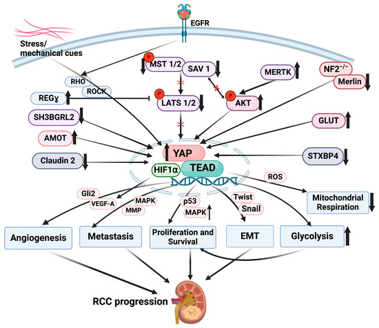 Upstream controls and downstream consequences of Hippo-YAP pathway activation in RCC progression. Mechanical cues and cellular shear stress induce YAP nuclear accumulation and transcription. YAP-mediated upregulation of Snail and Twist transcription factors results in EMT in RCC cells. Growth factors like EGFR upregulation during cancer progression activate Rho GTPases which regulate YAP signaling. YAP is also activated by MERTK through Akt mobilization. NF2/Merlin upregulates YAP during RCC progression, which can orchestrate glycolysis activation and mitochondrial respiratory defects. Amot interacts with YAP, maintains its nuclear accumulation and promotes YAP-mediated RCC proliferation. During hypoxic conditions, YAP upregulation and association with HIF1α induces VEGF-A, thereby increasing angiogenesis and RCC progression. ↑ implies upregulation; ↓ implies downregulation; Red X implies inactivation.