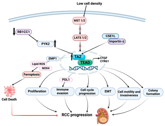 Upstream control of Hippo-TAZ pathway activation leading to renal tumorigenic phenotypes (e.g., proliferation, cell motility, invasion and EMT). Downregulation of the tumor suppressor gene RB1CC1 activates the proto-oncogene PYK2 which, in turn, promotes TAZ protein stability and stimulates immune evasion mediated by CsE1L gene overexpression. In contrast, low cell density promotes TAZ nuclear levels upregulating, thereby EMP1, lipid ROS, and NOX4-mediated ferroptosis of RCC cell lines. TAZ overexpression in RCC cells causes EMT, cell proliferation, and colony formation, leading to RCC progression. ↑ implies upregulation; ↓ implies downregulation; Red X implies inactivation.