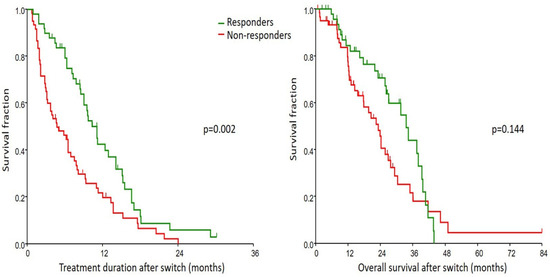 The median follow-up was of 27.9 (95% CI 26.3–84) months. TD and OS after switch are presented in Figure 2. (See Table 1 for median survival values).