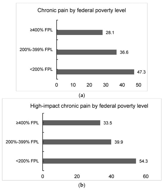 (a) Distribution of chronic pain by federal poverty level (n = 4585). (b) Distribution of high-impact pain with physical limitations by federal poverty level (n = 1184).