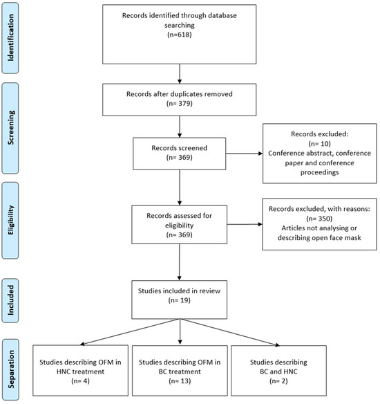 In accordance with the Preferred Reporting Items for Systematic Review and Meta-Analysis (PRISMA) extension for scoping reviews [15] and the Arskey and O’Malley framework [16], an electronic search was conducted to retrieve complete original studies reporting the use and description of OFMs in clinical practice. Studies were searched in EMBASE, PubMed, SCOPUS, and Web of Sciences until April 2024. The specific search strings for each database, developed and optimized with the support of the University of Florence library system, are provided in the “Supplementary Materials” section (Supplementary Table S1). The inclusion criteria were (a) English-language publications; (b) Studies addressing the use and/or the implementation of OFMs as an immobilization device for HNC and BC patients undergoing RT; (c) Studies performed on human subjects and/or phantoms. Studies were excluded if one of the domains for the inclusion criteria was not met. Conference abstracts, conference proceedings, and conference papers were excluded. According to the classification of types of medical research [17], both primary and secondary research studies published on the selected databases were included in the search strategy.