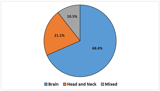 The articles were categorized according to the treatment site, which led to the identification of three groups: BC (n = 14, 68.4%), HNC (n = 4, 21.1%), and mixed sites (n = 2, 10.5%), which included both BC and HNC. This classification is illustrated in the pie chart reported in Figure 2.