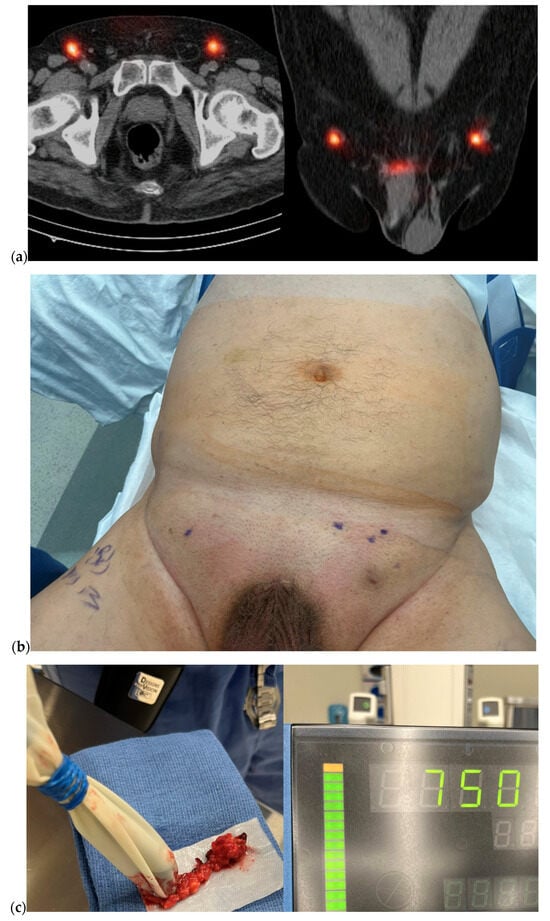 An example PSCC case who underwent DSLNB for staging of inguinal lymph nodes. (a) Preoperative axial and coronal images of single-photon emission computed tomography/computed tomography (SPECT/CT) demonstrating sentinel lymph nodes in bilateral groins. (b) Skin markings showing the location of sentinel lymph nodes where the incisions were to be made. (c) Intraoperative image of gamma-probe re-confirming high radioactivity in the resected inguinal lymph node.