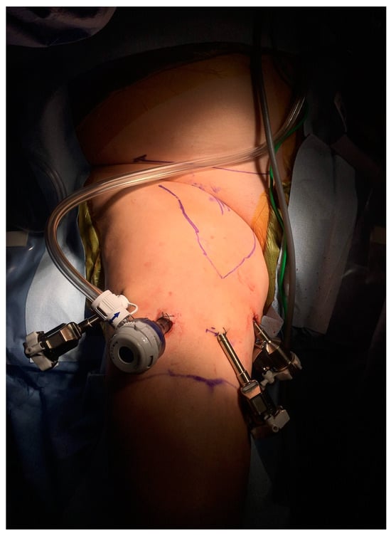 Although several previous retrospective studies have reported consistent findings suggesting that VEIL could provide similar oncologic efficacy compared to open ILND with less postoperative complications, notably wound infections and skin necrosis [35,38,39], the added benefit of minimally invasive ILND in terms of healthcare spending was not justified yet. Indeed, several minimally invasive thoracic and abdominopelvic oncological procedures, particularly radical prostatectomy, cystectomy, and nephrectomy, were shown to be cost-effective or potentially cost-effective compared to comparative open procedures [40]. The main drivers for increased cost were length of hospital stay and equipment costs. In previous studies of ILND for PSCC, the procedural costs appeared to be higher in robotic procedures; however, hospital stay, time off work, postoperative re-admissions, and costs of complications were not considered [33]. Taking the multitude of additional variables into account may likely give better insight to the cost of different ILND approaches. Of these variables, it is worth mentioning that in one study, the length of hospital stay, as expected, was significantly shorter, by 5 days, in patients who underwent minimally invasive ILND compared to those who underwent open surgery [41]. Finally, a few recent case reports also demonstrated the feasibility and safety of single-port robotic-ILND (Figure 4) for the treatment of palpable inguinal lymph nodes in patients with PSCC [42,43,44].