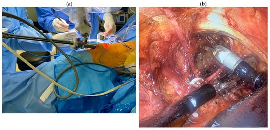 An example PSCC case who underwent single-port robotic-VEIL. (a) Placement of a single robotic trocar above the knee. (b) Laparoscopic view of the inguinal region during surgical dissection.