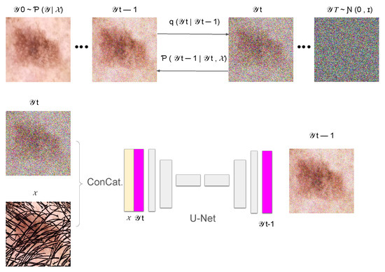 In this section, we introduce DM–AHR (Diffusion Model for Automatic Hair Removal), based on modifying the standard architecture of Denoising Diffusion Probabilistic Models (DDPM) [11] for the purpose of automatic hair removal in dermoscopic images. The global architecture of DM–AHR is illustrated in Figure 1.