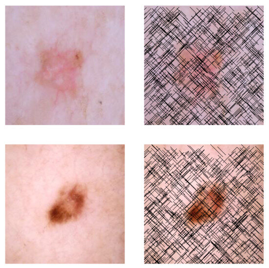 This self-supervised approach significantly augments the model’s proficiency in processing real-world dermatoscopic images while obviating the necessity for a large corpus of manually annotated images obscured by hair. Figure 3 presents two exemplar images produced by this technique, which effectively mimic natural hair patterns. This visual mimicry is instrumental in enabling the DM–AHR model to autonomously discern and segregate hair from skin features. Notably, the implementation of this technique has led to a substantial enhancement in the performance of the DM–AHR model, which complements its prior training on the meticulously constructed DERMAHAIR dataset, as detailed in the subsequent section.