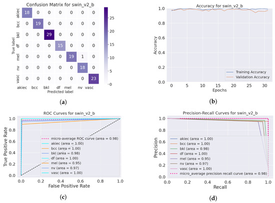 Performance of the skin classification using Swin Transformer after using DM–AHR (dehaired images): (a) Confusion matrix, (b) accuracy curve during training, (c) ROC curve, (d) precision–recall curve.
