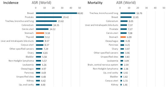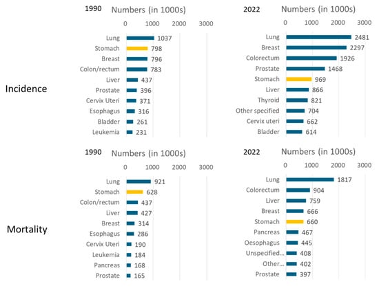 According to an estimate by the International Agency for Research on Cancer (IARC) (Global Cancer Observatory: Cancer Today) [1], the number of incident cases of gastric cancer worldwide made it the fifth-most common cancer after lung, breast, colorectal, and prostate cancers in 2022. This is despite ranking second only to lung cancer in 1990 [2]. Moreover, the number of deaths in 2022 ranked fifth after lung, colorectal, liver, and breast cancers, again despite ranking second to lung cancer in 1990 (Figure 1) [1,2]. These changes make apparent a steady decline in gastric cancer, although it remains one of the major cancers worldwide. The 2022 age-standardized rate of gastric cancer worldwide ranks it fifth for incidence and seventh for mortality (Figure 2).