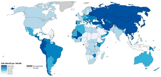 - Bray, F.; Colombet, M.; Aitken, J.; Bardot, A.; Eser, S.; Galceran, J.; Hagenimana, M.; Matsuda, T.; Mery, L.; Piñeros, M.; et al. Cancer Incidence in Five Continents, XII (IARC CancerBase No. 19); International Agency for Research on Cancer: Lyon, France, 2023. [Google Scholar]