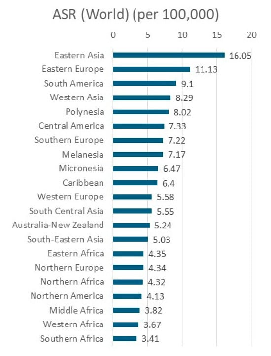 Age-standardized (world) incidence rate of gastric cancer by UN Region in both sexes in 2022 [1].