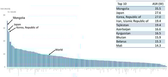 Age-standardized incidence rate (world) of gastric cancer by country ranking in both sexes in 2022 [1].