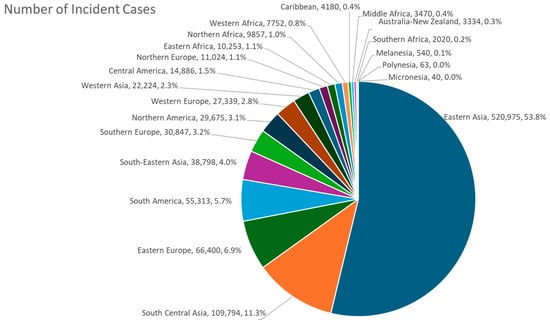 Distribution of gastric cancer by UN region by absolute numbers in both sexes in 2022 [1].