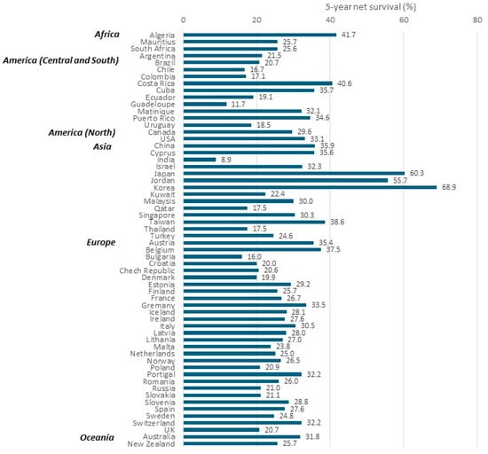 Global distribution of age-standardized 5-year net survival for adults (15–99 years old) diagnosed with gastric cancer in 2010–2014 (both sexes) [3].