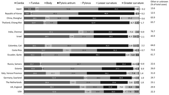 Comparing the subsite distribution of gastric cancer from the global cancer registry data [4], a higher proportion of distal gastric cancer is observed in populations such as Japan and Korea, where gastric cancer is more common, than in populations where gastric cancer is less common, including the UK and USA (Figure 8). Even among Western populations, those with high rates of gastric cancer tend to have higher rates of distal disease than other Western populations. Over the past decades, gastric cancer has markedly decreased globally, as Helicobacter pylori (H. pylori), a major cause of gastric cancer, has declined significantly. It is known that countries with a high H. pylori infection rate have a higher proportion of cancers in the more distal part of the stomach than countries with a low H. pylori infection rate.