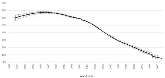 H. pylori remains the leading cause of gastric cancer, particularly non-cardia. Infection generally occurs in childhood, commonly before the age of 5, and is thus strongly associated with environmental hygiene during childhood, such as eating behaviors like mouth-to-mouth feeding [9]. These factors in infancy substantially determine the infection rate in adulthood. Of note, gastric cancer was the most common cancer in the last century in Japan, and the prevalence of infection with H. pylori has decreased with a birth cohort effect [10,11] with a peak at around 70–80% for people born in 1930–1940 but a decrease with age to only approximately 5% for people born around 2000 and without any substantial change in rate during life in each cohort (Figure 9). Moreover, estimates among Japanese children and adolescents clearly follow the trend in Japanese adults, in whom the prevalence of H. pylori was 10% for those born in 1985 but decreased to 3% for those born in 2011 [12]. This suggests that strategies to prevent gastric cancer have generational effects. Moreover, it also suggests that countries with similar experiences should investigate risk-stratified approaches to gastric cancer prevention in the coming decades. A similar decreasing trend has been seen in Korea [13,14]. National-level improvements in hygiene and overall socioeconomic status, generally influenced by a history of hygiene and health policy at the national level, will lead to a major decrease in the overall prevalence of H. pylori infection among all age groups, including countries with a high prevalence of infection. Infection will eventually become rare, and gastric cancer will commensurately decline.