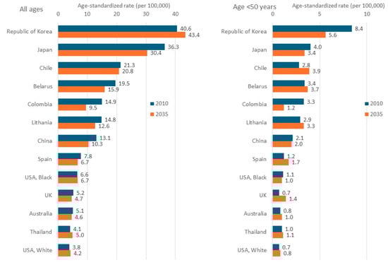 The future burden of gastric cancer is of intense interest, as it is based on substantial changes in risk factors and environment over an extended period. The estimated incidence of gastric cancer from 2022 to 2045 indicates an increase in the number of new cases from 969,000 to 1.67 million worldwide and in most geographical regions (Figure 10) [33]. Focusing on the incidence rate, by contrast, provides a somewhat different perspective. A global assessment of the predicted incidence trend of gastric cancer from 2010 to 2035 showed that overall age-standardized incidence rates will continue falling in most countries, both high- and low-incidence. In many populations, by contrast, an increase in incidence rate is seen in younger groups (below 50 years) (Figure 11) [34]. This prediction implies that, in spite of the declining trend, more gastric cancer cases will occur in the next few decades due to aging and the growth of high-risk populations and that recent increases in younger ages among high-income countries indicate a generational transition in risk factors, from H. pylori and tobacco smoking, for example, to obesity [34].