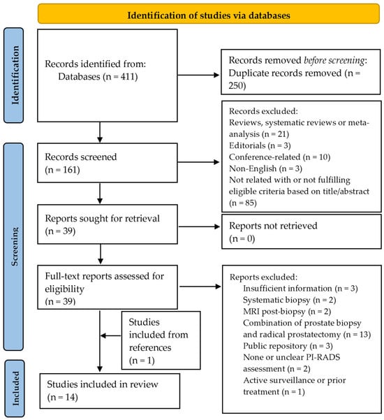 Most of the studies (9 of 14, 64%) were based on prostate biopsy as the reference standard [24,25,26,27,30,31,33,34], and the remaining five (36%) were based on radical prostatectomy [28,29,32,35,37]. All of them had the procedure performed after the MRI, but half of the studies did not report the period between the MRI and the procedure. It ranged from four weeks to 12 months in the studies in which it was reported [25,26,27,29,30,31,33]. Transrectal ultrasound (US) was the preferred approach for performing the prostate biopsy in all the studies except in one case, which was not reported [27]. Five studies specified MRI/US fusion technique as the preferred choice [24,25,26,31,34] while only two preferred cognitive targeting [30,33]. The remaining two studies did not specify [27,36].