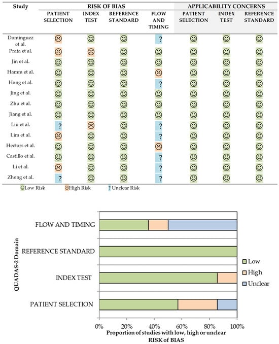 QUADAS-2 risk of bias and applicability concerns of the selected studies (top, [24,25,26,27,28,29,30,31,32,33,34,35,36,37]) and its corresponding graphical representation (bottom).