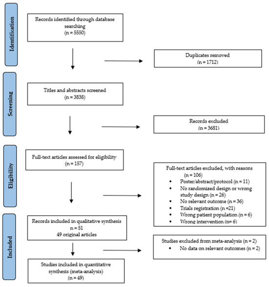 The searches identified 5550 records (Figures S2 and S3). After removing duplicates and screening, 49 studies were included [36,37,38,39,40,41,42,43,44,45,46,47,48,49,50,51,52,53,54,55,56,57,58,59,60,61,62,63,64,65,66,67,68,69,70,71,72,73,74,75,76,77,78,79,80,81,82,83,84], reported in 51 publications, with two of these being follow-up analyses [85,86]. All studies were included in the narrative review (Figure 1).