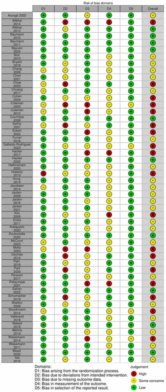 Risk of bias assessment for each study is reported in Figure 2. Most (n = 23) were assessed to have some concerns [36,42,43,44,45,47,54,58,60,61,62,63,65,66,68,71,73,77,79,81,82]. Eighteen were evaluated as high risk [37,46,48,49,50,52,53,55,56,59,64,69,70,72,74,76,78,86] and ten as low risk [38,39,40,41,51,57,67,75,80,83]. High risk and some concerns were mainly due to Domain 2, deviations from the intended intervention, or Domain 3, missing outcome data.