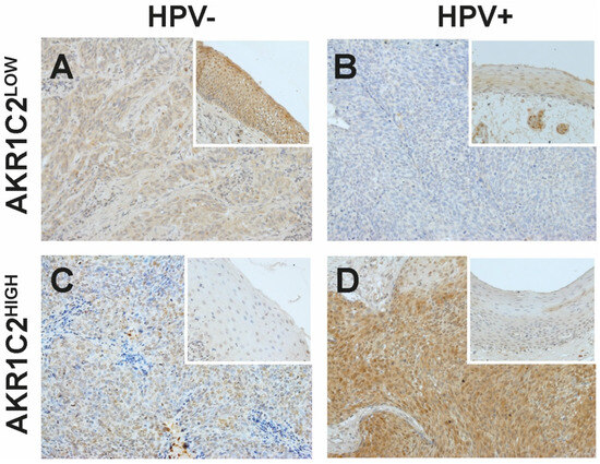 Representative immunohistochemical staining against AKR1C2 in non-tumorous (small rectangular images) and tumor tissue samples (A–D). AKR1C2LOW indicates lower and AKR1C2HIGH indicates higher expression of AKR1C2 compared to the adjacent non-tumorous epithelium. (A,C) HPV-negative (HPV−) OPSCC, (B,D) HPV-positive (HPV+) OPSCC. V = x200.