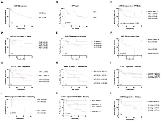 Univariate survival analysis for AKR1C2 expression status with low vs. high protein expression in tumor compared to adjacent non-tumorous epithelium. p value was derived by log-rank/Mantel–Cox test. Analyses of HPV status (B), AKR1C2 expression combined with sex, and combinations of AKR1C2 expression and HPV status in women (J) and men (K) proved to be significant.