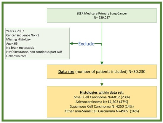 Inclusion/Exclusion Criteria: From the SEER-Medicare dataset, a total of 30,230 individuals were identified as having a BrM after a lung cancer diagnosis between 2007 and 2017 (Figure 1, described in Results). Only those individuals that were 66 years and older when diagnosed with lung cancer were selected for the study to ensure a full year of comorbidity data extracted from the claims. Individuals were categorized into 4 histopathology groups, either SCLC (ICD-O-3 Codes 8002–8005, 8041–8045), squamous-cell NSCLC (ICD-O-3 Codes 805 [1, 2], 807 [0–6], 8078, 808 [3, 4], 8090, 8094, 8120, 8123), adenocarcinoma NSCLC (ICD-O-3 Codes 8015, 8050, 814 [0, 1, 3–5, 7], 8190, 8201, 8211, 825 [0–5], 8260, 8290, 8310, 832 [0, 3], 8333, 844 [0, 1], 847 [0, 1], 848 [0, 1], 8490, 850 [3, 7], 8550, 857 [0–2, 4, 6]), and other NSCLC (ICD-O-3 Codes 801 [2–4], 8021, 8034, 8082, 8046, 800 [3, 4], 8022, 8030, 803 [1–3, 5], 8120, 8200, 824 [0, 1], 824 [3–6, 9], 8430, 8525, 856 [0, 2], 8575) using International Classification of Disease for Oncology, Third Edition (ICD-O-3) histopathology codes; individuals missing histology codes were excluded. Individuals were excluded if they were additionally enrolled in a Health Maintenance Organization (HMO) insurance coverage or if they were lacking continuous Medicare part A and part B enrollment for 1 year prior to the date of lung cancer diagnosis through the date of death/last follow-up, or the end of adverse event observation time (6–9 months after diagnosis), depending on which occurred first. Individuals with unknown race were also excluded.
