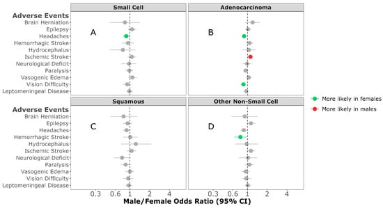 Male/female odds ratio of adverse events for individuals with small-cell (A), adenocarcinoma (B), squamous-cell carcinoma (C), or other non-small-cell carcinoma (D) BrM OR calculated using multivariable logistic regression model. All groups were adjusted for race, ethnicity, time to BrM after initial cancer diagnosis, Elixhauser score, year of diagnosis, age at BrM diagnosis, surgery, radiation, chemotherapy, targeted therapy, and immunotherapy categories.
