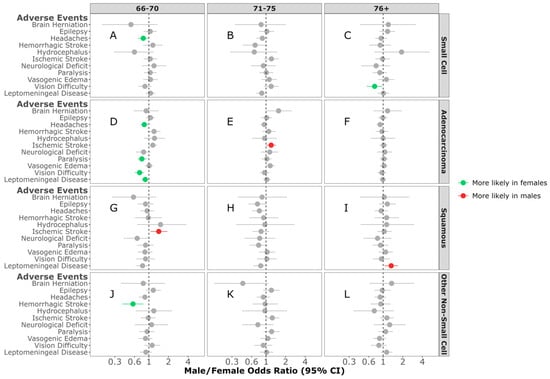 Age Difference in AEs: In individuals diagnosed between 66 and 70 years of age with SCLC BrM, females were more likely to experience headaches (M/F OR = 0.82; 95% CI, 0.68–0.99, p = 0.038) (Figure 3A). No sex differences were observed in any of the AEs between individuals diagnosed with SCLC BrM between 71 and 75 years of age (Figure 3B). Females diagnosed with SCLC BrM who were ≥76 years of age were more likely to develop vision difficulty (M/F OR = 0.73; 95% CI, 0.56–0.95, p = 0.022) when compared to males (Figure 3C). In individuals diagnosed between 66 and 70 years of age with adenocarcinoma NSCLC BrM, females were more likely to experience headaches (M/F OR = 0.86; 95% CI, 0.76–0.98, p = 0.02), paralysis (M/F OR = 0.78; 95% CI, 0.67–0.92, p = 0.002), vision difficulty (M/F OR = 0.71; 95% CI, 0.60–0.83, p < 0.001), or develop a leptomeningeal disease (M/F OR = 0.88; 95% CI, 0.78–1.00, p = 0.043) compared to males (Figure 3D). In contrast, males aged 71–75 years of age were more likely to experience an ischemic stroke (M/F OR = 1.22; 95% CI, 1.03–1.44, p = 0.024) (Figure 3E). No sex differences were observed in any of the AEs between individuals diagnosed with adenocarcinoma BrM ≥ 76 of age (Figure 3F). In individuals diagnosed with squamous NSCLC BrM, males aged 66–70 years old were more likely to experience an ischemic stroke when compared to females (M/F OR = 1.43; 95% CI, 1.06–1.93, p = 0.02) (Figure 3G). No sex differences were observed in any of the AEs in individuals aged 71–75 years at diagnosis (Figure 3H). Those aged ≥76 years of age were more likely to experience leptomeningeal disease when compared to females (M/F OR = 1.32; 95% CI, 1.04–1.68, p = 0.022) (Figure 3I). Among those diagnosed with other NSCL BrM, females aged 66–70 years were more likely to develop hemorrhagic stroke (M/F OR = 0.57; 95% CI, 0.39–0.82, p = 0.003) (Figure 3J). No sex differences were observed in any of the AEs in individuals diagnosed with other NSCL BrM aged 71–75 (Figure 3K) or ≥76 years of age (Figure 3L).