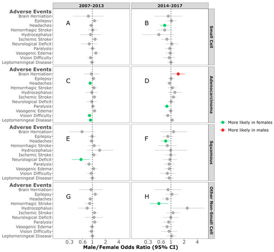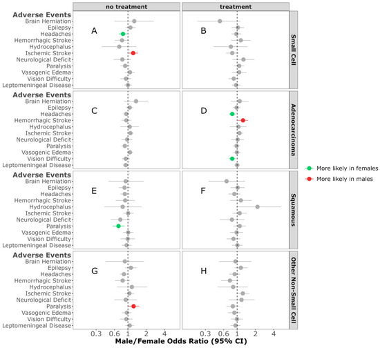 Cancer-Directed Treatment Difference in AEs: In individuals diagnosed with SCLC BrM who received no treatment, females were more likely to have headaches (M/F OR = 0.83; 95% CI, 0.71–0.96, p = 0.012) (Figure 4A). No sex differences were observed in any of the AEs in individuals diagnosed with SCLC BrM who received treatment (Figure 4B). No sex differences were observed in any of the AEs between individuals diagnosed with adenocarcinoma BrM who did not receive treatment (Figure 4C). Females, compared to males, were more likely to have headaches in those diagnosed with adenocarcinoma NSCLC BrM, and received treatment (M/F OR = 0.82; 95% CI, 0.73–0.92, p < 0.001) (Figure 4D). In individuals who received no treatment for their squamous NSCLC BrM, females were more likely to be diagnosed with paralysis when compared to males (M/F OR = 0.70; 95% CI, 0.56–0.88, p = 0.002) (Figure 4E). No sex difference was observed in any of the AEs in individuals receiving treatment for squamous NSCL BrM (Figure 4F). In contrast, in individuals diagnosed with other NSCLC BrM who did not receive treatment, paralysis was more likely in males compared to females (M/F OR = 1.25; 95% CI, 1.02–1.54, p = 0.034) (Figure 4G). No sex differences were observed in any of the AEs between individuals diagnosed with other NSCL BrM and receiving treatment (Figure 4H).