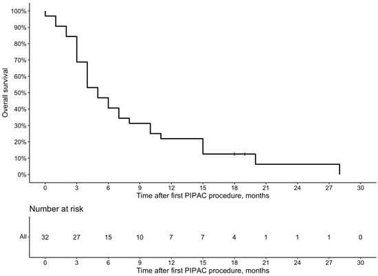 The median time to follow-up after diagnosis of PM was 13 (Q1 9; Q3 18) months. The median OS after the PM diagnosis by Kaplan–Meier analysis was 12.5 (95% Cl 10–17) months (Figure 2), and after the first PIPAC procedure, it was 5 (95% Cl 4–10) months (Figure 3).