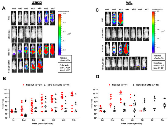 DLBCL cell line engraftment and tumor growth in NSG-IL6 and NSG-IL6/SGM3 mice. (A,C) Representative weekly BL images of (A) U2932-Luc and (B) VAL-Luc transplanted in NSG, SGM3, NSG-IL6, and IL6/SGM3 mice models. All signals were normalized in one scale as shown. A total of 5 × 106 U2932-Luc and VAL-Luc cells in 100 µL of PBS were injected into the different strains of mice (8~12 weeks old) via the tail vein. (B,D) All total flux values (red circle or black triangle; NSG-IL6 or NSG-IL6/SGM3, respectively) with the median (line) are expressed as a progression of lymphoma. While no engraftment was observed in U2932- and VAL-transplanted NSG-SGM3 mice, NSG-IL6 mice for both and NSG-IL6/SGM3 mice of VAL showed engraftment.