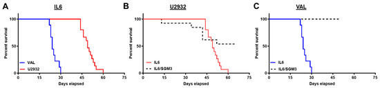 The survival comparison of intravenous DLBCL xenografts in NSG-IL6 mice. Mice were monitored weekly. When the mice met endpoint criteria, they were euthanized and survival recorded. (A) Survival curves representing 9 mice from VAL-Luc-engrafted NSG-IL6 mice (blue solid line) and 15 U2932-Luc NSG-IL6 mice (red solid line). The median survival was 24 days for VAL-Luc-engrafted NSG-IL6 mice compared to 49 days for U2932-Luc-engrafted NSG-IL6 mice. The Mantel–Cox test showed p = 0.0001. (B) The survival curve representing the comparison between U2932-Luc-engrafted NSG-IL6 and NSG-IL6/SGM3 mice. The median survival was 49 days for NSG-IL6 mice and undefined in NSG-IL6/SGM3 mice (p = 0.0294). (C) The median survival represents the NSG-IL6 mice vs NSG-IL-6/SGM3 mice in VAL-Luc-engrafted mice and recorded as 24 d vs. undefined (p = 0.0001).