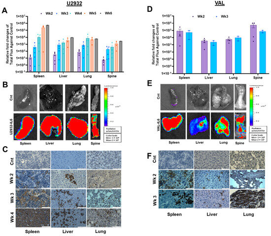 Previously, the subcutaneous passaged WSU in NOD/-scid mice demonstrated lymph node infiltration [26]. U2932 and primary DLBCL cells in the MISTRG mice engrafted with cord blood human hematopoietic stem (HSC) cells or non-engrafted MISTRG6 showed spleen infiltration [14]. To assess organ-specific engraftment of DLBCL cells in NSG-IL6 mice, we euthanized four xenografted mice per week at weeks 2–6 post-injection and performed ex vivo imaging of the excised organs. U2932-Luc cells were initially found in the spleen, liver, and lungs starting in week 2 (Figure 3A,B, left panels). Subsequently, U2932 cells were found in the ovaries of female mice, which is reflective of the parental tumor [19], spine, and brain (Supplementary Figure S1). VAL-Luc cells also showed a similar pattern but occurred earlier (Figure 3D,E, right panels). Both U2932-Luc and VAL-Luc cells in NSG-IL6 mice exhibited a highly uniform tissue tropism that was unique to each cell line (spleen > liver > lung > brain > ovary). Next, we confirmed U2932-Luc and VAL-Luc infiltrations into the initially targeted organs and spleen, liver, and lung tissues by immunohistochemistry (IHC) staining for the human CD20 B cell surface marker. IHC staining showed a low CD20 positive cell infiltrate at the second-week post-injection that steadily increased at the third- and fourth-week post-injection (Figure 3C,F), consistent with the BL imaging (Figure 1 and Figure 3A,D). Notably, the NSG-IL6 mouse spleens at week 4 were dominated by the U2932-Luc cells. These findings confirm the early and highly permissive IL6-expressing mice for the engraftment and growth of DLBCL cells in organs consistent with clinical disease progression.