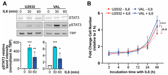 The IL6 activation of STAT3 and proliferation of DLBCL cells. (A) The Western blot analysis of STAT3 and phosphorylation of STAT3 (pSTAT3) in response to human IL6 treatment (50 ng/mL) for 30- or 60-min incubation in U2932 and VAL DLBCL cells. The quantification of pSTAT3 band intensity is shown below. Adjusted p-values as determined by a one-way ANOVA. * p < 0.05, ** p < 0.01, *** p < 0.001. The uncropped blots are shown in Figure S3. (B) The fold change in viable cell number after 2–48 h incubation with and without human IL6 (50 ng/mL) of U2932 and VAL DLBCL cells. Adjusted p-values as determined by a one-way ANOVA with Šídák’s multiple comparison test of the area under the curve (AUC). **** p < 0.0001. Data represents mean ± s.d. from three independent experiments.