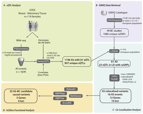 Chicago/Turabian StyleBesouro-Duarte, André, Beatriz Carrasqueiro, Sofia Sousa, Joana M. Xavier, and Ana-Teresa Maia. 2024. "Colocalised Genetic Associations Reveal Alternative Splicing Variants as Candidate Causal Links for Breast Cancer Risk in 10 Loci" Cancers 16, no. 17: 3020. https://doi.org/10.3390/cancers16173020