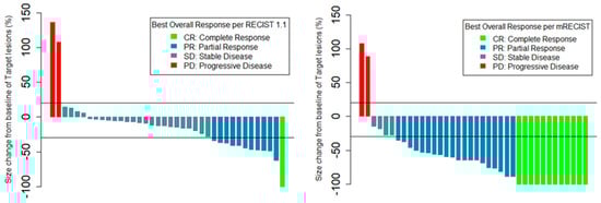 Best percent change in size of target lesions per RECIST v1.1 and mRECIST.